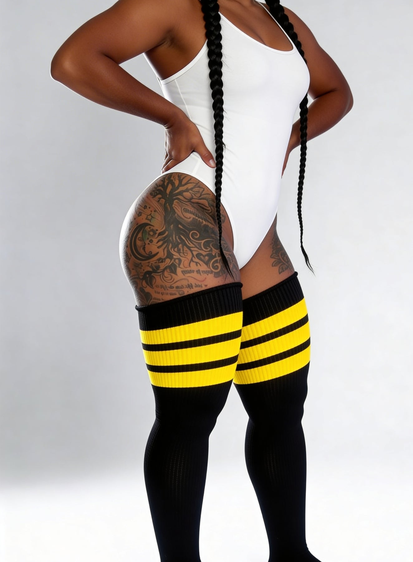 Sunset Horizon is part of our Stripe Socks collection — designed specifically for fuller thighs with soft stretch comfort, elevated height, and a bold athletic look that feels intentional the second you put them on.